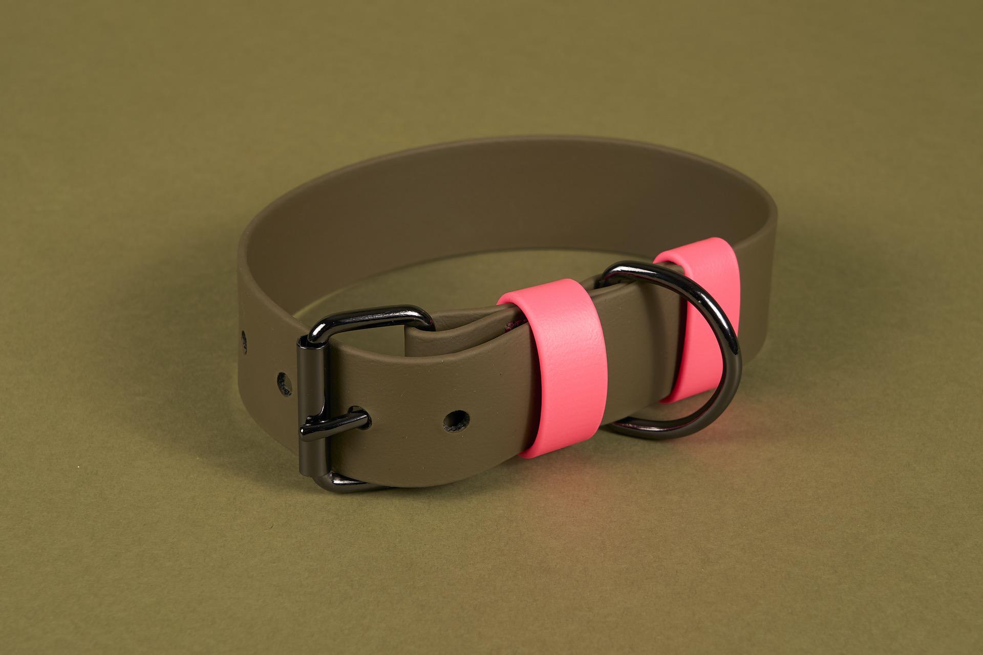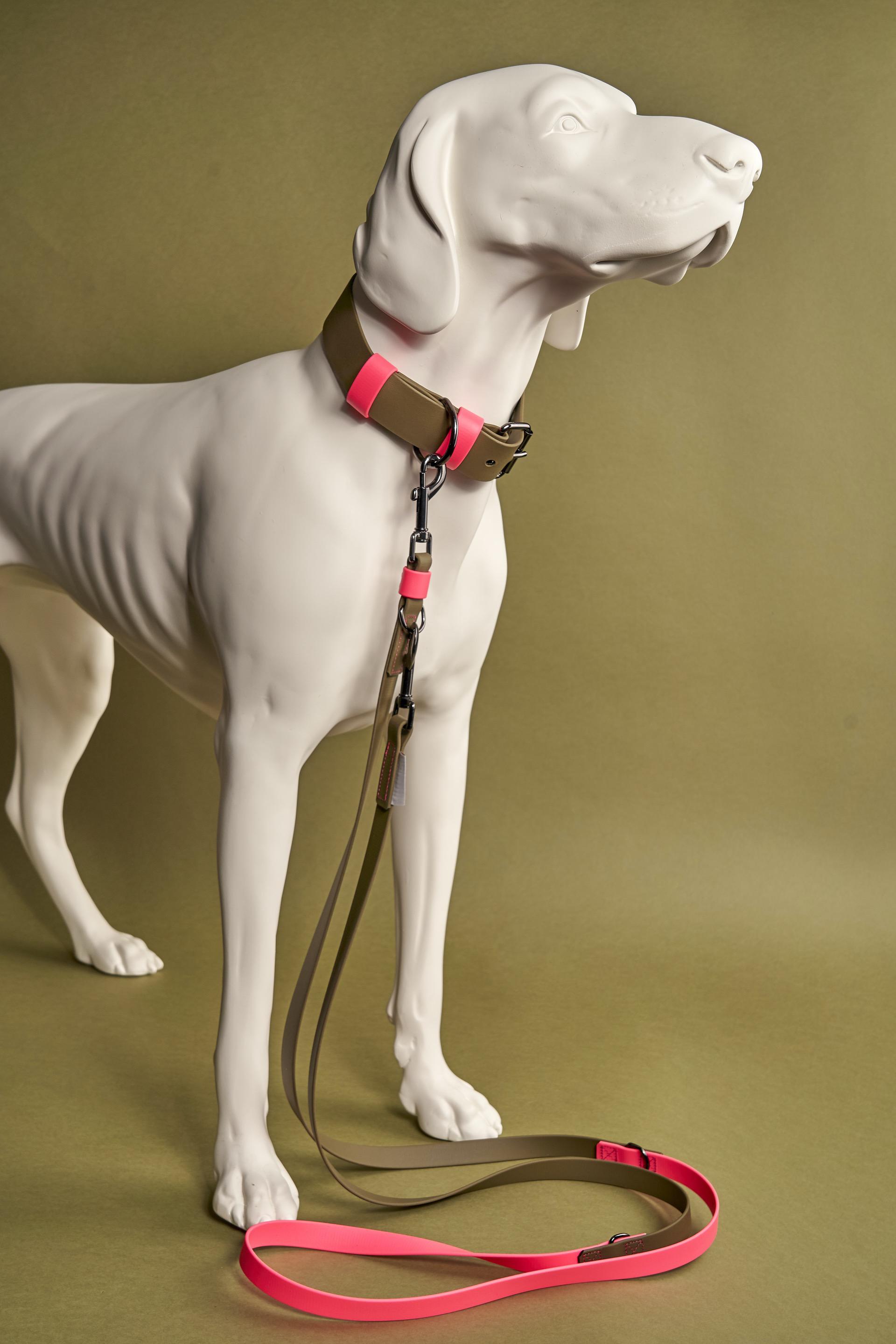 The Charlie Brown collar is also available in olive-pink. It is a real eye-catcher in every dog park. The special thing about this collar are the pink loops and seams on the olive-colored material. The collar gets its elegant finish not least from the classy dark gray metal fittings.