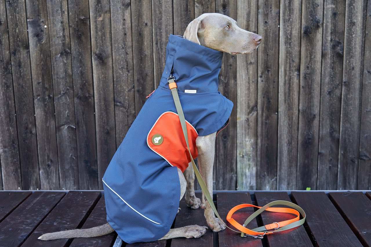Egal ob Vizsla, Weimaraner, Rhodesian Ridgeback, Boxer, oder Dalmatiner. Unsere Mäntel bieten einen idealen Sitz und ausreichend Bewegungsfreiheit auch für deinen Hund. Emma trägt einen Regenmantel Cooper mit einem Brustband in der Farbe Pumpkin Orange.